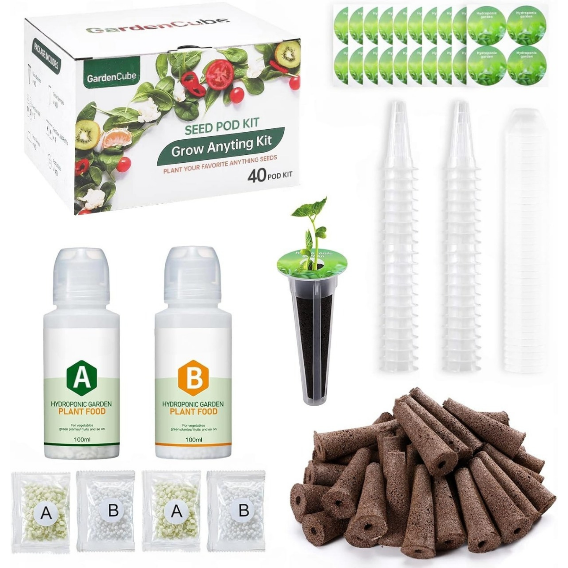 يشمل 40 إسفنجة زراعة، 40 سلة زراعة، 40 غطاء نمو، 40 ملصق تعريف، مغذي A&B سعة 600 مل (4 عبوات تعبئة)، وملقط – كل ما تحتاجه للزراعة المنزلية المائية.