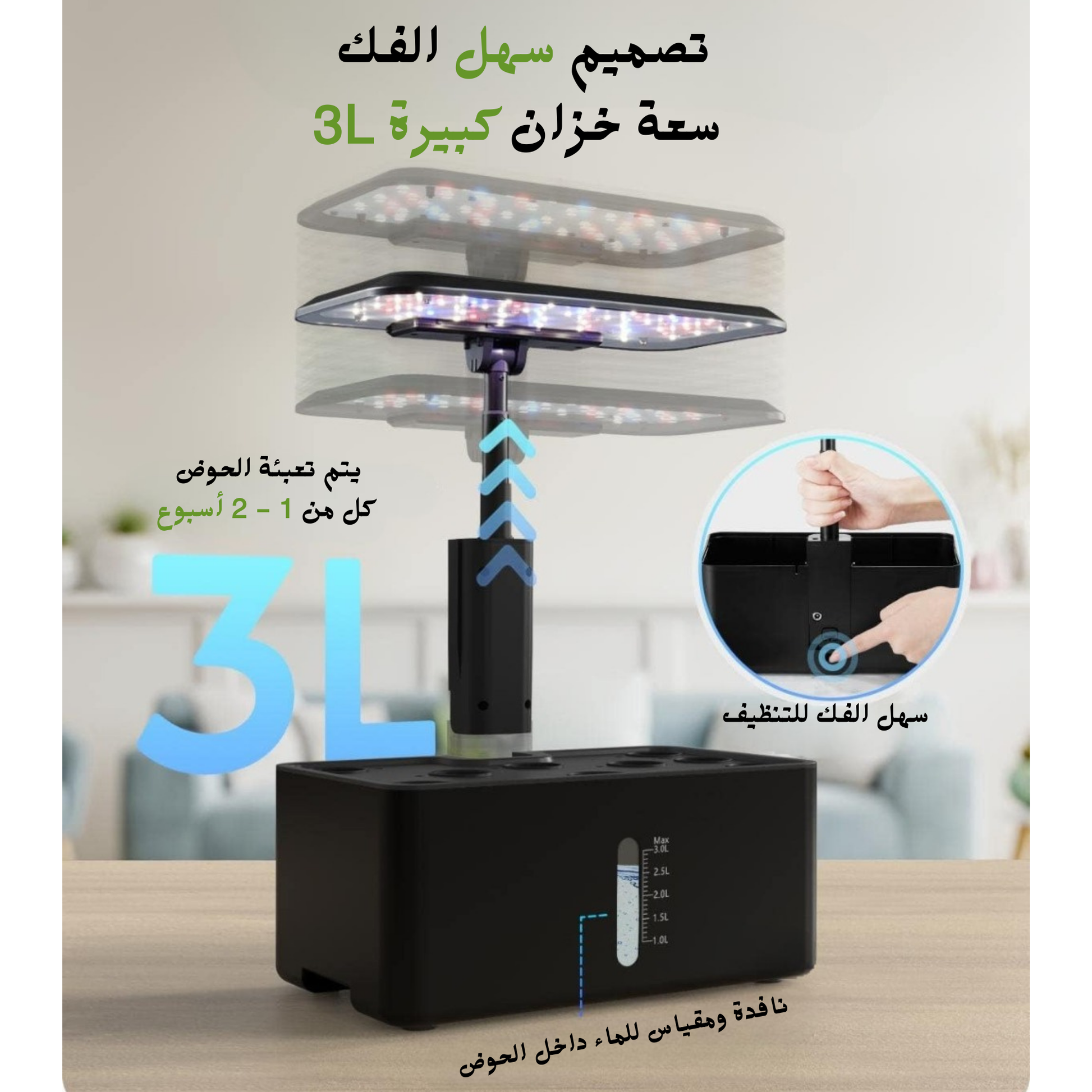 الإضاءة LED بقوة 24 واط تحاكي ضوء الشمس الطبيعي وتُسرّع نمو النباتات حتى 5 مرات مقارنة بالزراعة التقليدية، كما تعمل بدورة إضاءة أوتوماتيكية توفر الراحة والفعالية.