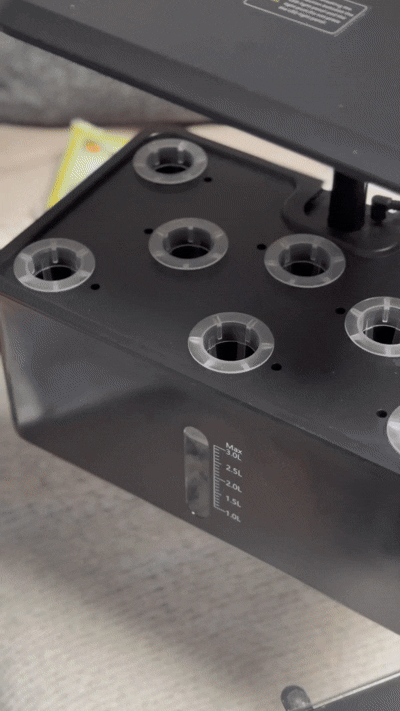 يعتمد على عدد النباتات ومرحلة نموها، ولكن عادةً ما يحتاج لإعادة تعبئة كل 1-2 أسابيع. المستشعر الأزرق يُنبه عند الحاجة